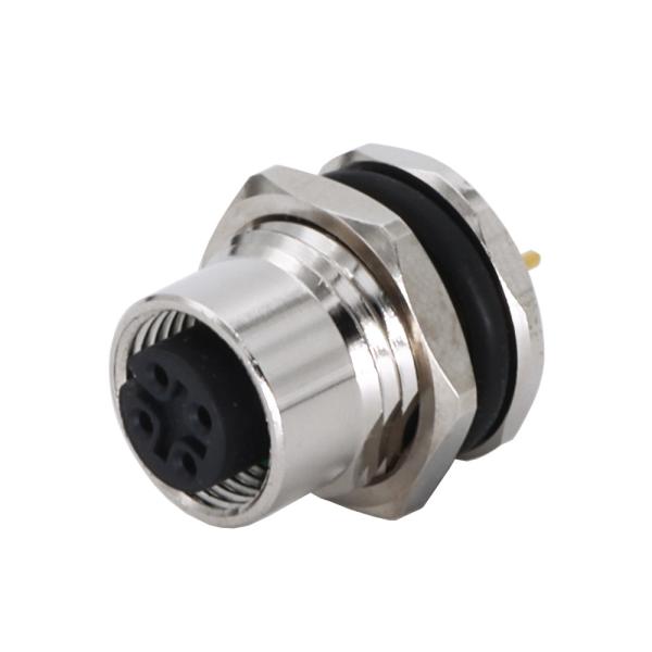 M12 panel mount connectors have 3/4/5/8/12 pole female circular panel mount socket featuring a metal body and IP67 protection rating. The socket features an M12 thread and 4A current rating, PCB contacts termination.